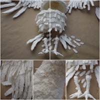 This piece is an attempt at representational art that retains provocative qualities of abstraction. I aimed to allow the audience to make imaginative associations with a bird, while still letting the packing peanuts stand out. I was able to change the form of packing peanuts without loosing their unique structure. The individual packing peanut were specifically transformed into 5 different styles of feathers. This was done by studying the many feather types that cover the swan. By positioning these packing peanuts in layers over a skeletal structure (also made of packing peanuts), I have created the illusion of ruffled feathers. Each packing peanut unit is hand pressed, feathered at the edges, folded for added dimension, and bent before being positioned on a tier of the hollow torso. The wings are bent to convey muscle strain and trick the audience into assuming movement, further cementing the illusion of a swan. The lighting and proportion is designed not to overwhelm the monochromatic palette, and the lightweight nature of packing peanuts shows the defiance of gravity. I want this piece to remind my audience of the beauty producible from the mundane. In a world where many quality art materials are accessible, it is important to remind young artists of the infinite possibilities any material can offer with a little spit and a lot of time.